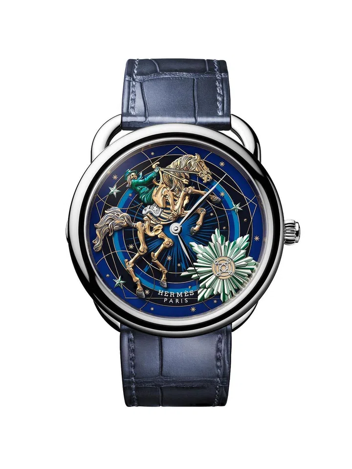 爱马仕(Hermes)的Arceau Chorus Stellarum重新诠释了庆祝时间流逝的喜庆和神秘主题。其表盘采用了活泼的骷髅骑手,以手工雕刻和涂绘的可移动黄金饰件体现。在9点钟位置轻触一下,这些角色就会活灵活现地围绕着一幅由凹嵌工艺创造的镀金星座舞蹈。这是该品牌首次推出的“按需触发”动画功能。限量发行6只。