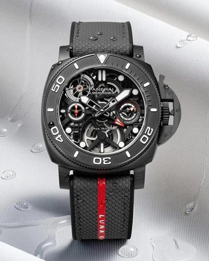 沛纳海(Panerai)以其独特设计和坚固耐用的腕表著称。沛纳海的Submersible潜行系列45毫米Luna Rossa体验版陀飞轮两地时手动上链腕表,是首款融合陀飞轮功能的Submersible潜行系列,表壳由Carbotech碳纤维制成,独特的陀飞轮每30秒旋转一圈,配备24小时第二时区功能和昼夜显示。限量发行20只。
