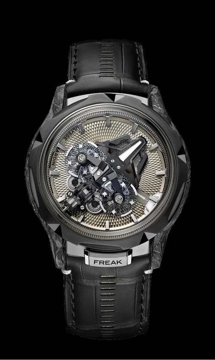 雅典表 (Ulysses Nardin)Freak S Nomad腕表未设表盘、未设指针,是以机芯中每小时旋转一圈的飞行卡罗素指示分钟,并在机芯下方的可旋转小时盘上以刻度指标指示小时。此款腕表的基础架构更是摒弃了表冠设计,改以表圈作为时间设置机构,抬起6点钟位置的锁扣,时间设置系统便随之启动。这一独特造型归因于品牌自制UN-251机芯的精妙构造。飞行卡罗素机芯绕其轴心自转,两个振荡器的矽质摆轮分别固定于两个呈20°夹角的平面,仿佛分置于两个发射台,通过安装于滚珠轴承上的垂直差速器相连接。擒纵机构的表面经过高科技DIAMonSIL钻石矽镀层处理,更加精准耐久。机芯采用雅典表创新研制的专利Grinder磨床式自动上链系统,效率是传统自动上链系统的两倍。限量发行99只。