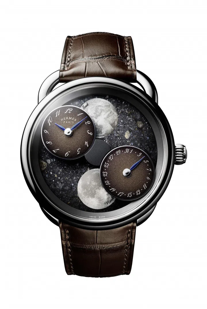 去年在表展上抢尽风采的爱马仕(Hermes)Arceau L'heure de la lune月读时光腕表,以独特的视角观察月亮的盈亏变化,两枚同时出现在表盘上的南半球和北半球月亮,刻意颠倒上下南北位置,12点钟位置的南半球月亮更装饰了梦想家兼插画家Dimitri Rybaltchenko所创作的Pleine Lune(满月)飞马图案,搭配漂浮在手表中的的时间与日期盘,显得魔幻又写实。两款白金新作各限量36只,分别以发现于撒哈拉沙漠的陨石及来自月球陨石作为表盘,天然纹路无疑为虚实之间令人迷惘的美丽月色增添魅力。另外还有火星陨石表盘搭配铂金表壳款式,全球限量2枚。