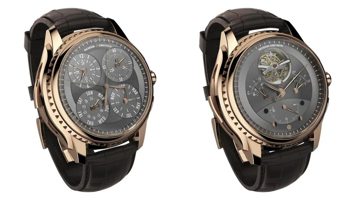 在江诗丹顿(Vacheron Constantin)全新推出的复杂功能作品之中,最耀眼的当属“阁楼工匠双追针计时Tempo腕表”( Grand Complication Split-Seconds Chronograph – Tempo)。这个双面腕表拥有多达24项复杂功能,采用可自行拆卸的表带结构,让佩戴者自行决定要戴哪一面。其正面有四个小表盘,上方的左右表盘,为偏心式时、分显示(左时右分);24小时制二地时间;双追针计时与30分钟累计计时盘;而下方二个小表盘则用来显示万年历;同时,表侧还可以启动三问报时,而且这个三问报时更采用模拟乐器的精密声学结构来确保音锤鸣响的和谐与清晰度,并与伦敦著名的“艾比路录音室”合作录下原版声音记录,并提供专属的认证证书。