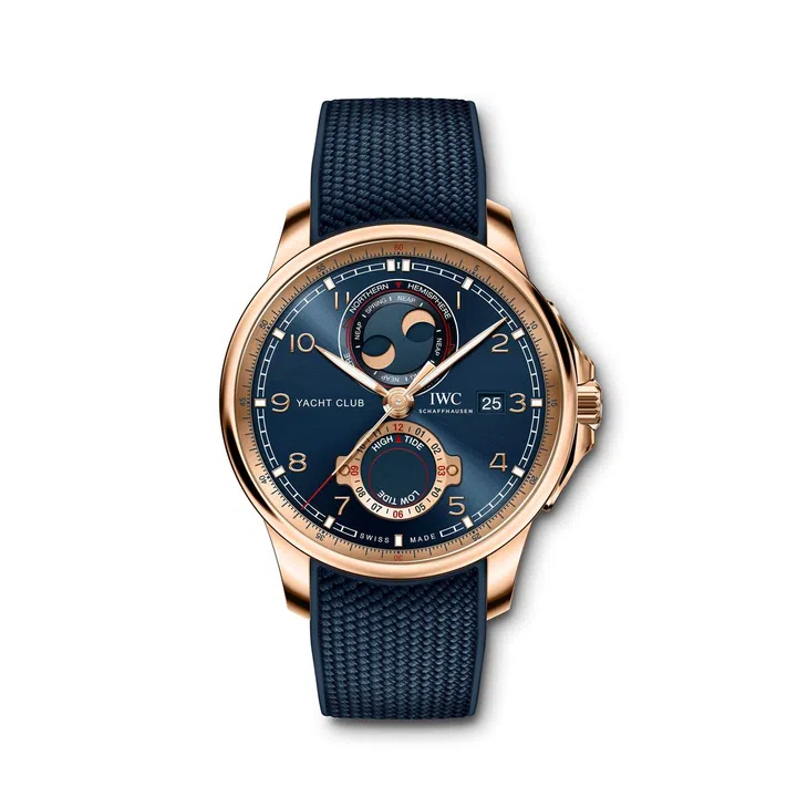 2010 年起,IWC 万国表葡萄牙Portugieser系列航海精英腕表为这个系列注入了运动风格。作为航海运动腕表,它将经典优雅的外观与坚固耐用性和超强防水性能的完美相融。这些特征令这款航海精英腕表成为功能极为丰富的“多面手”,无论在水上还是陆地使用均能成为瞩目焦点。新款腕表的两大亮眼特征是金银丝工艺表圈和扁平型表壳外圈,二者共同赋予 44 毫米直径的表壳尤为优雅和谐的比例。值得一提,全新葡萄牙系列航海精英月相潮汐(Portugieser Yacht Club Moon & Tide)腕表是 IWC 万国表首款配备新研制潮汐显示功能的作品,6 点钟位置的小表盘预报下一次涨潮和落潮的时间。12 点钟位置的双月相显示经过改进,可显示大潮和小潮,也能够指示当前潮水的强度。“大潮”时水位极高,通常发生在满月和新月时分。