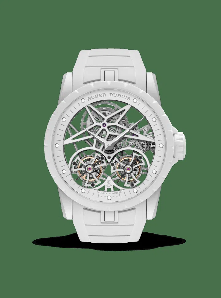 罗杰杜彼(Roger Dubuis)秉持着颠覆性精神,一直以来不断大胆采用其他行业的前卫材料(例如钴或碳)以突显其大胆独具的风格。全新Excalibur Twofold腕表融合了三项世界首创技艺。首先,其直径45 毫米的表圈和表壳由矿物复合纤维(MCF)制成,这是一种由罗杰杜彼特别研发、以99.95%的二氧化硅制成的超白复合材料。第二,罗杰杜彼还领先研发出一项获得专利的创新工艺,使得以矿物复合纤维制成的机芯上层主夹板能够拥有明亮的荧光转角:它们在夜间可持续发亮的时间比一般惯用的标准夜光材质多出60%。最后,此表款所搭配的Twofold 表带由一种特殊的FKM 橡胶制成,也同样具有荧光效果:得益于世界首创的LumiSuperBiwiNova™技术,此表带的某些部分会在黑暗中微微发光,犹如一道迷人的夜间信号。