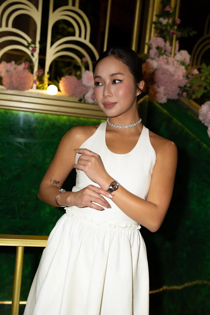 担任《魔法坏女巫2》新加坡首映礼主持人的本地DJ Germaine Leonora佩戴欧米茄(Omega)Constellation系列28毫米腕表粉红色款衬托一身白色造型,散发出满满甜美气息。