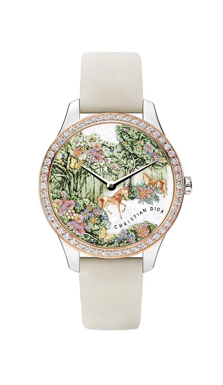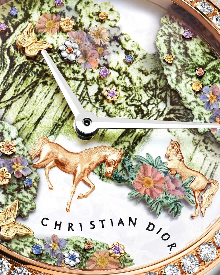 全球限量30只的迪奥(Dior)Grand Soir 2026马年腕表由精钢打造,玫瑰金表圈镶嵌52颗钻石,精钢表冠镌刻CD标志 。珍珠母贝面盘点印有花卉图案、珍珠母贝灌木与花朵细节镶嵌紫水晶、锰铝榴石、黄与蓝色刚玉,粉金马匹、蝴蝶与花卉装饰,搭配玫瑰金太妃时、分指针与CHRISTIAN DIOR字样。