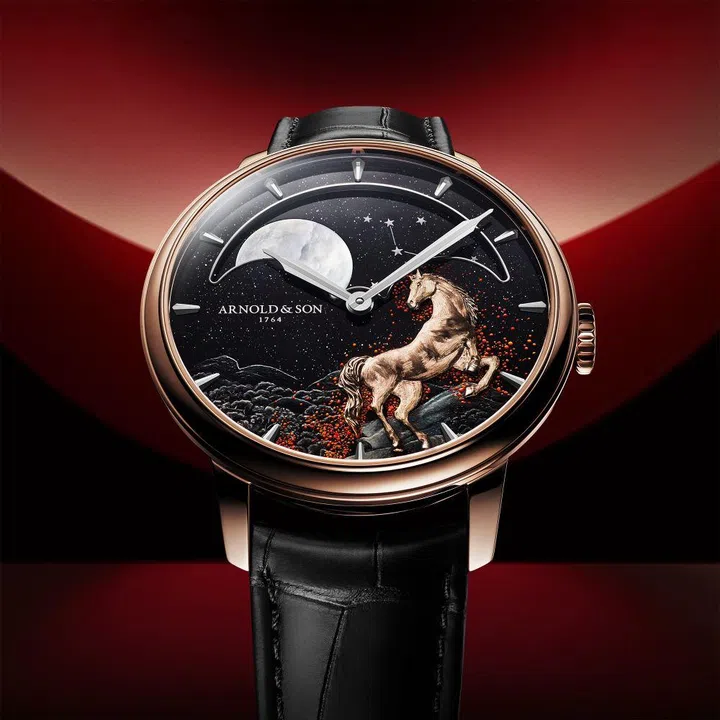 雅诺(Arnold & Son)推出限量发行8枚的Perpetual Moon 41.5 Red Gold Year of the Horse腕表,表盘上呈现一匹骏马扬蹄而立在山巅之上的场景,其威严轮廓映衬繁星夜空,周身环绕象征火焰的光焰。