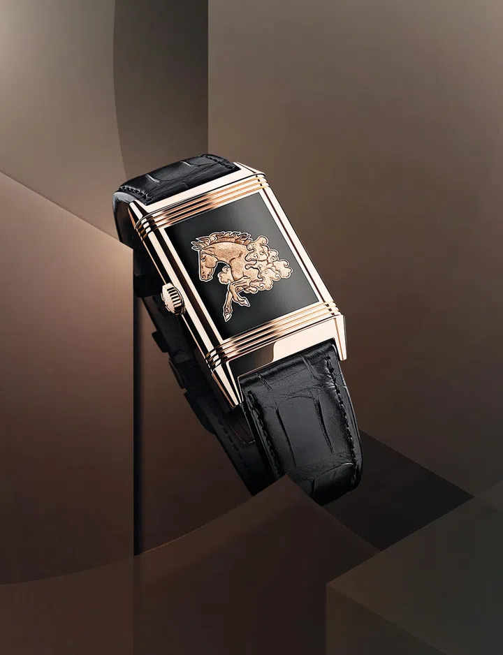 此外,积家还推出限量发行10枚的Reverso Tribute Enamel‘Horse’翻转系列珐琅腕表马年特别款, 表背上手工镌刻威风凛凛的骏马图案,周围以不透明黑色大明火珐琅为衬;飘舞的马鬃、紧绷的肌肉纹理以及飞扬的马蹄等鲜明细节,皆以黑色铑金属手工精心描绘,赋予其栩栩如生的灵动神态。此外,镌刻大师运用“浮雕”工艺进一步强调镌刻图案的立体感与深邃感,表盘同样覆盖亮面黑色大明火珐琅,并延续此系列腕表一贯的装饰艺术设计风格。