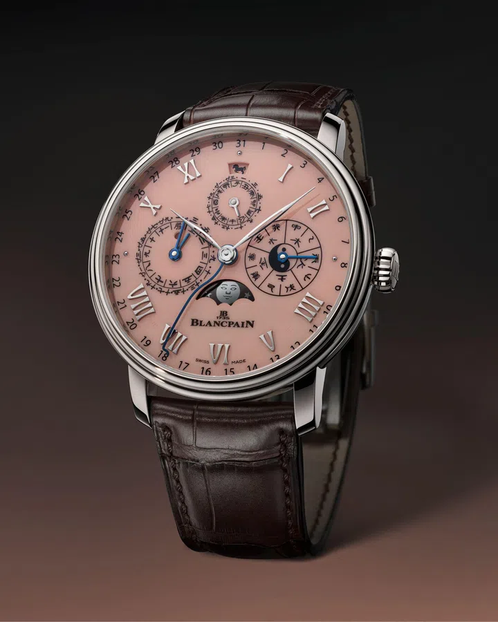 为迎接2026年2月17日中国农历丙午马年的到来,这款限量发行50枚的专属生肖款时计采用了全新的视觉设计元素——三文鱼色大明火珐琅表盘,这是宝珀色彩与材质世界里的新成员。宝珀Villeret经典V系列中华年历“马踏飞燕”马年限量腕表,保留了简约、低调的美学风格,并沿用了该系列的签名式设计元素,包括:经典双圆表圈、大明火珐琅表盘(表盘小时刻度由金质立体镶嵌罗马时标组成,其他数字显示及标识皆由高温烧制而成),以及精致镂空的柳叶形时分指该款时计中亦有呈现。