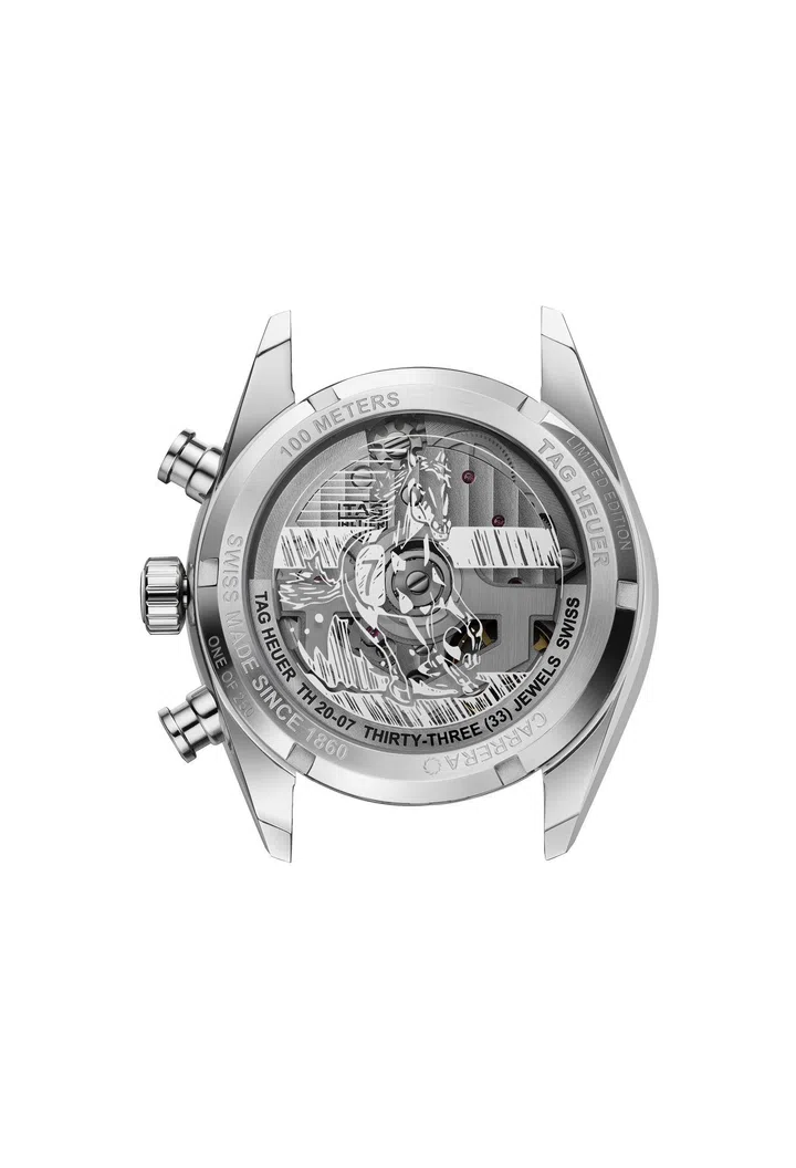 机芯的动力来源出自Calibre TH20-07自动上链机芯,透过背面透明蓝宝石水晶一览无遗。奔马图案与桂冠花环让人联想到TAG Heuer与F1的渊源,象征胜利与荣光。全球限量250枚。