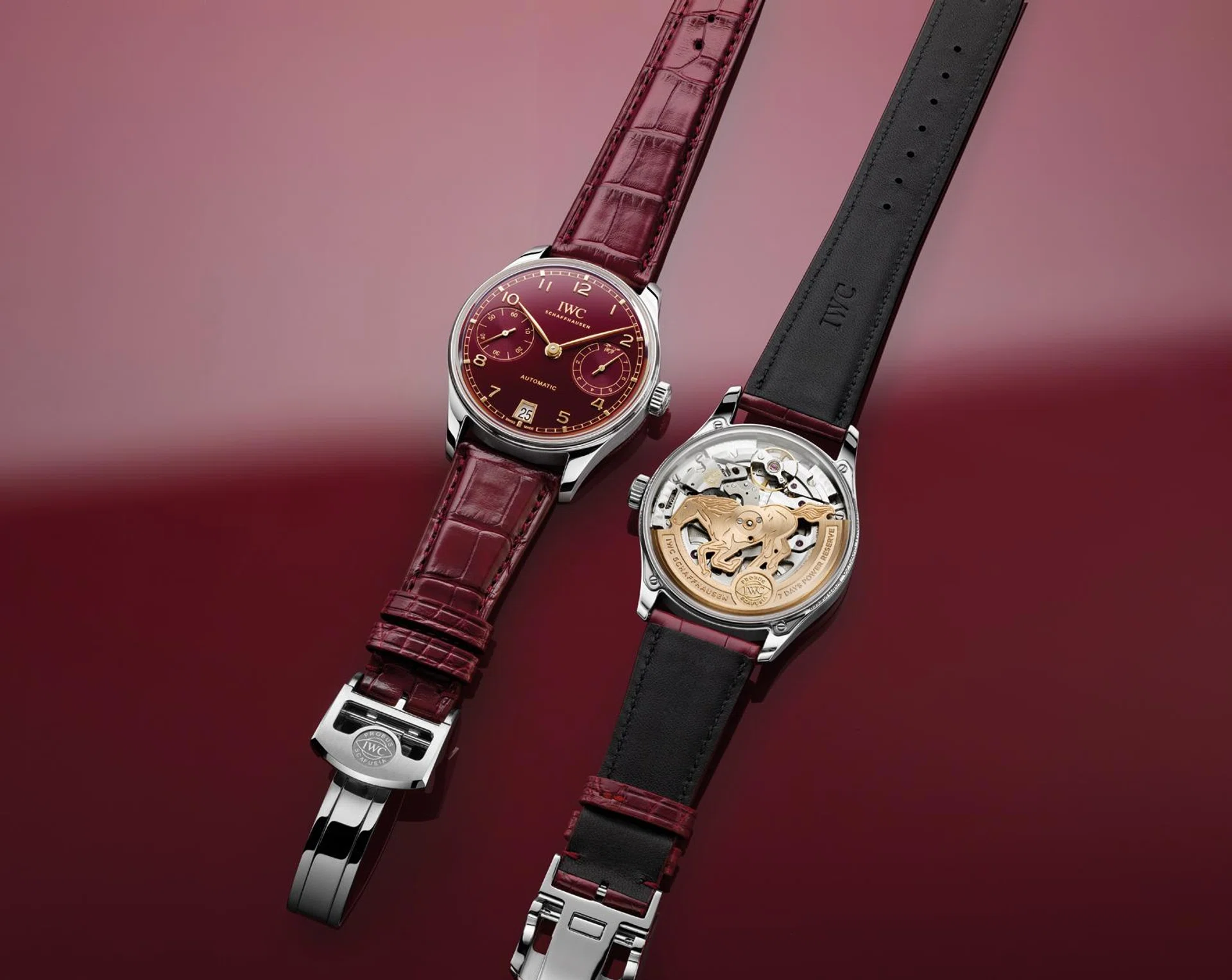 往年都会发表特别版时计迎接农历新年的IWC万国表,今年同样延续传统,呈献限量500枚的葡萄牙系列自动腕表42马年特别版(IW501709)。 新作以经典的葡萄牙自动腕表42(葡七)为基底,并采用低调内敛又应景的勃艮第红色太阳纹表盘及标志性布局,包括9点钟位置的小秒盘,3点钟位置的动力储备显示。金色指针、罗马数字时标、镶贴时标与浓郁的勃艮第红色表盘相得益彰。此外,6点钟位置低调设置日期显示窗。还有一个值得留意的细节是,动力储存显示盘上方的“0”区域,即常规款标注“DAYS”字样的位置,刻画了一匹小型骏马,低调融入“马年”元素。
