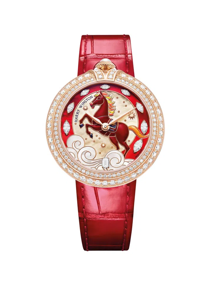 海瑞温斯顿(Harry Winston)自2016年起每年都会发表生肖表,今年也不例外,全新登场的Moments系列马年限量款腕表以玫瑰金打造表壳,表径为36毫米,表盘上栩栩如生的骏马采用鲜艳的红色漆面,弧形表面不仅赋予骏马饱满的立体感,更凸显出其健硕的肌肉线条,而红色手工漆面细节与被微风拂动、呈现黄橙色漆面的鬃毛形成鲜明对比。