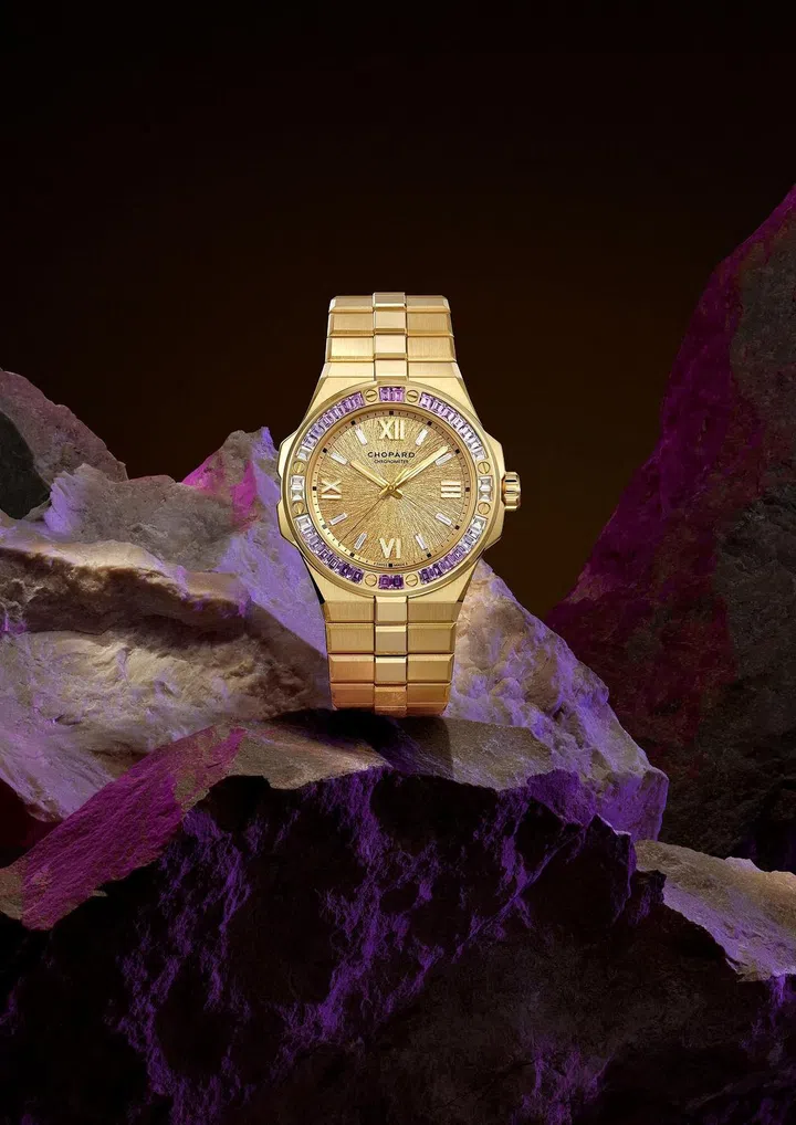 此外,每款臻品时计的表盘都极富纹理质感,呈现出犹如鹰眼虹膜般的放射状图案,淋漓尽致地展现出属于Alpine Eagle雪山傲翼系列的独特魅力。其中,“金色山峰”黄18K金表款的表圈饰有八颗功能性定位螺丝,其间点缀的粉色蓝宝石于明灭之中散发柔和光彩。